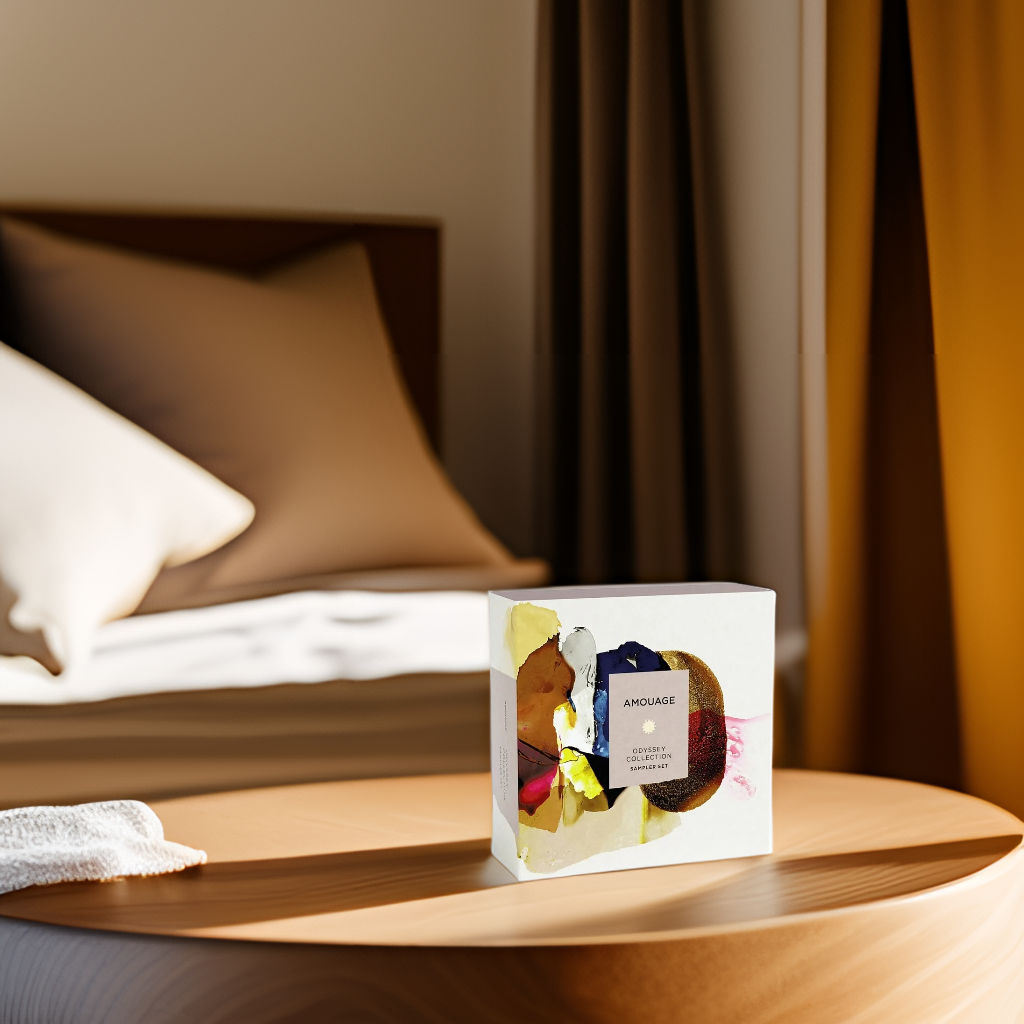 Explore luxury with Amouage's 4-vial Odyssey Set, expertly wrapped for sampling or gifting, and crafted to transport your senses on an aromatic voyage.