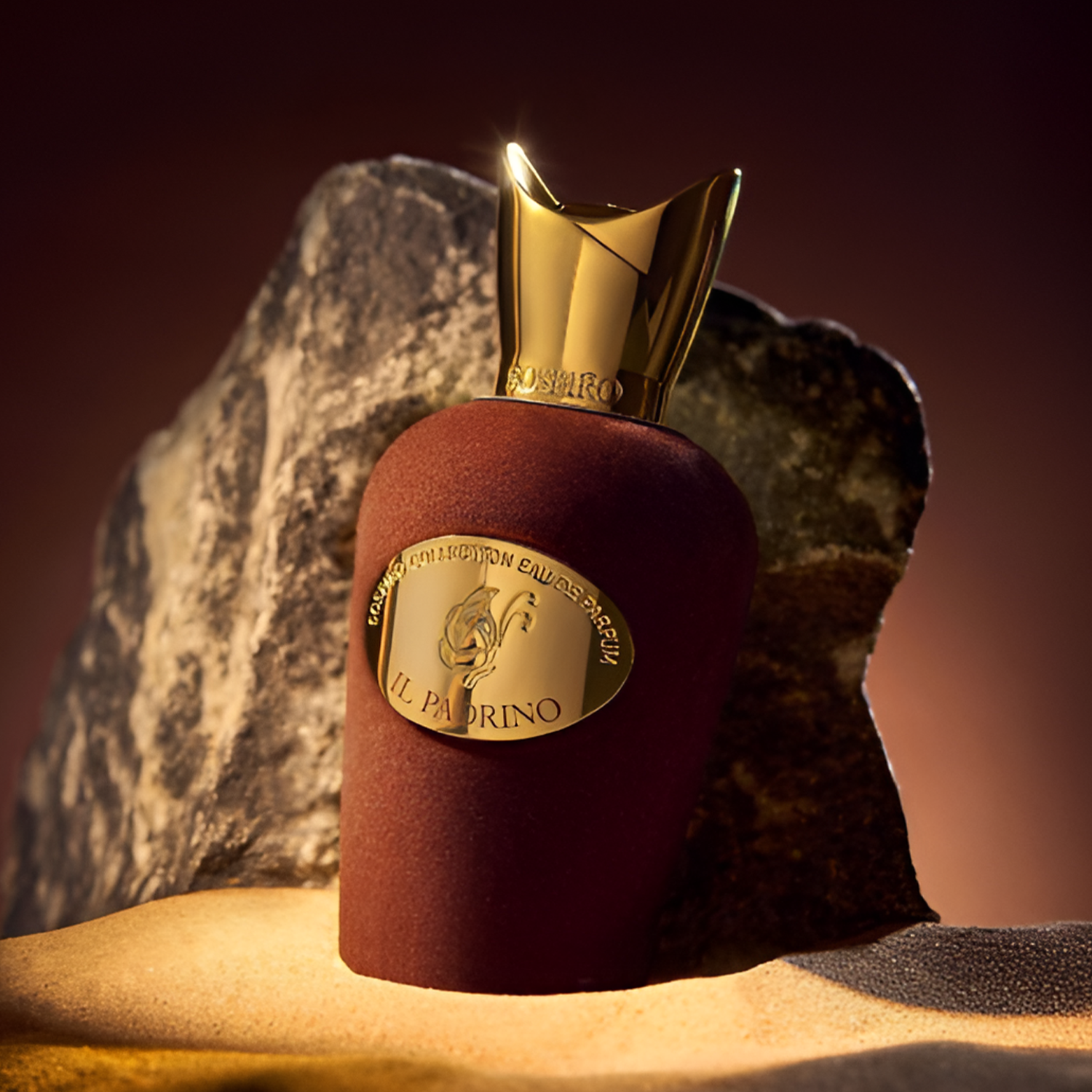 Sospiro Il Padrino EDP is a bold, boozy oriental gourmand that balances dark fruit and warm sweetness. It pairs rum-soaked accords with amaretto and ambered vanilla for a resinous, slightly playful character.