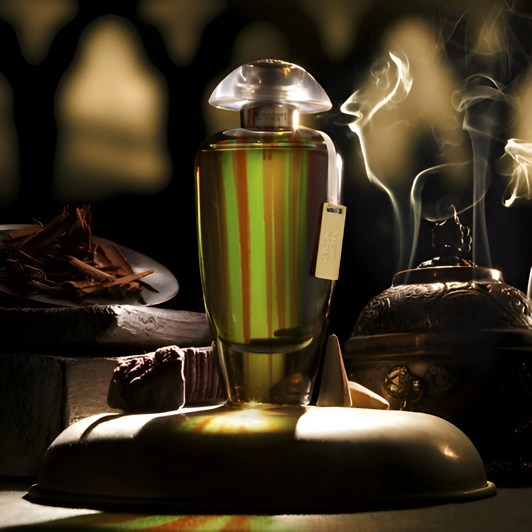 Mystic Incense smells like rich, warm incense — a resinous, smoky blend with sweet balsamic and amber warmth, rounded by woody and spicy undertones.